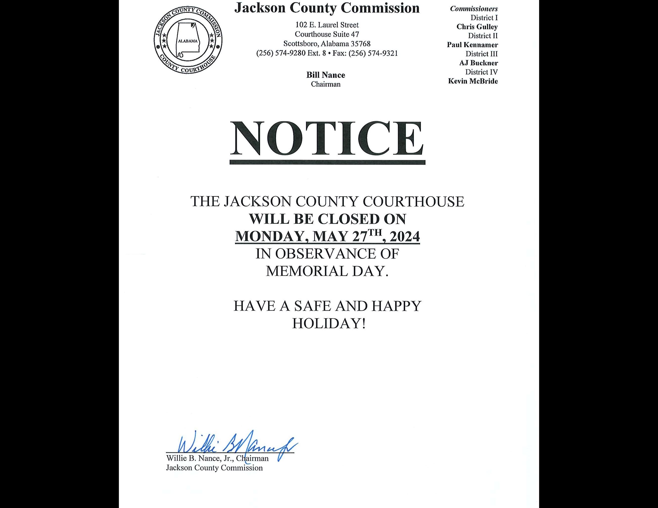The Courthouse will be closed Monday, May 27, 2024 for the Memorial Day Holiday.